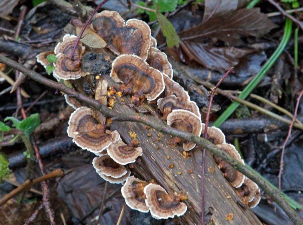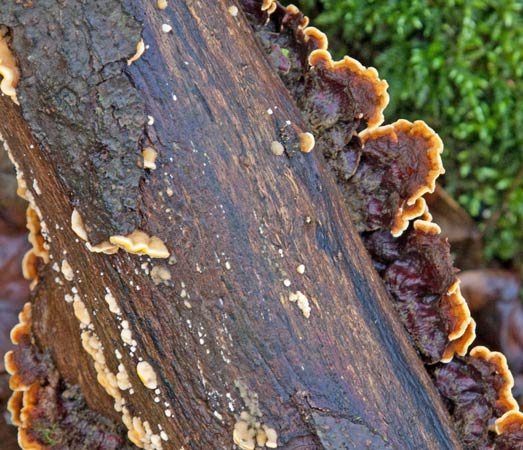 ein schöner Pilz im Feuchtwald bei der Neumühle: Samtiger Schichtpilz (Stereum subtomentosum) ...mehr über unsere → Pilzarten im Glemstal |