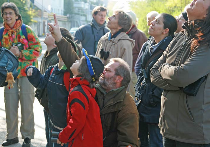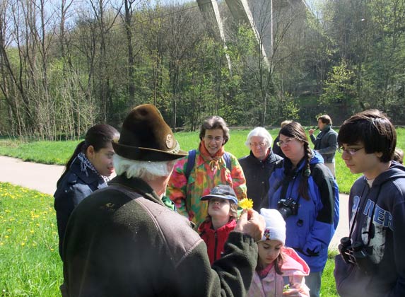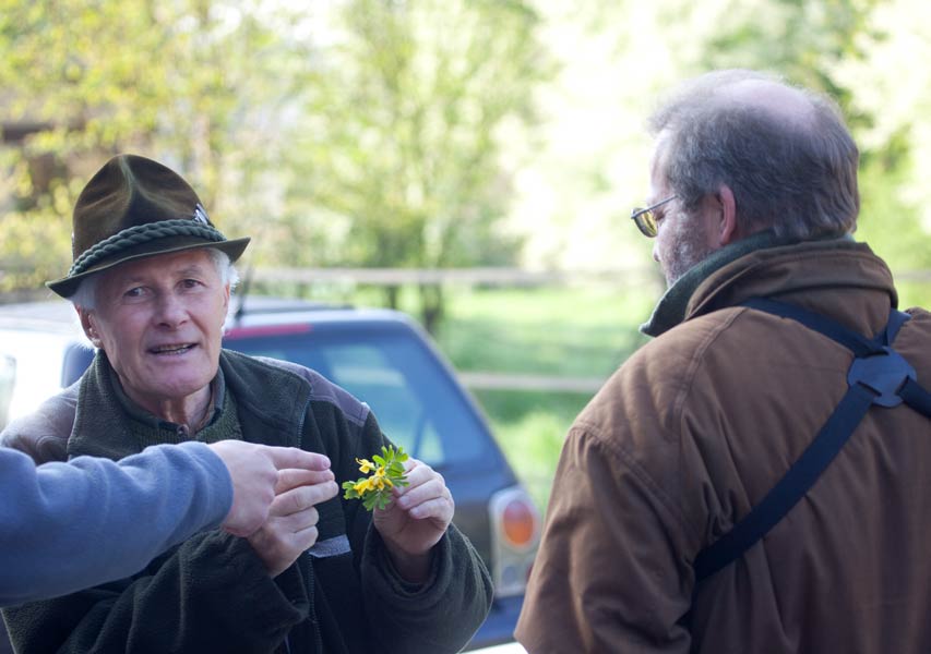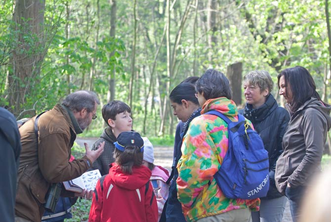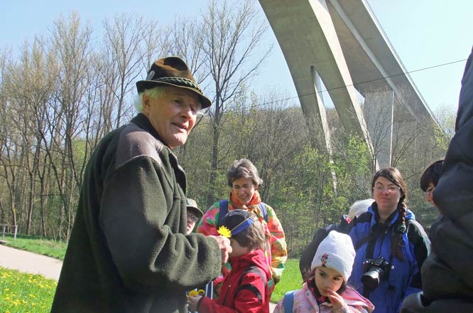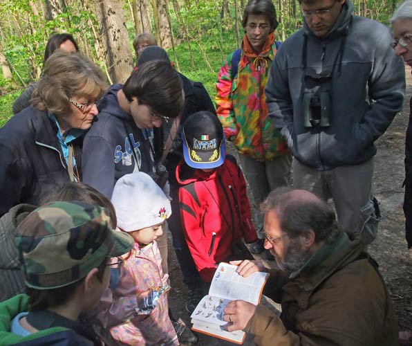Johannes Völlm zeigt den Kindern eine Mönchsgrasmücke ... mehr über unsere → Mönchsgrasmücke im Glemstal |