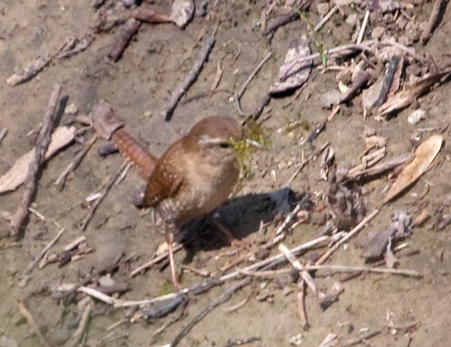 der Zaunkönig hat Moos im Schnabel und baut ein Nest direkt am Ufersaum der