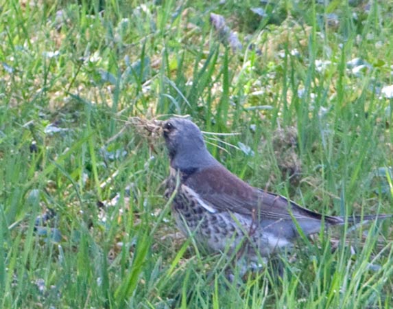Wacholderdrossel baut ein Nest aus Grashalmen