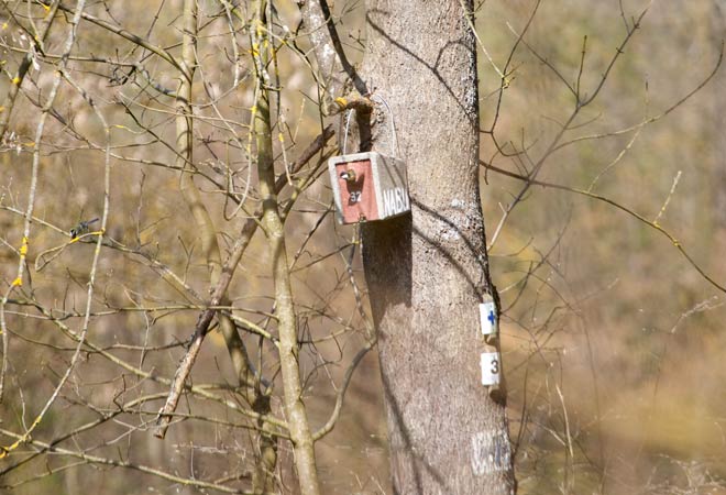 zwei Kohlmeisen haben den Nistkasten an der Markungsgrenze bezogen. Fliegen