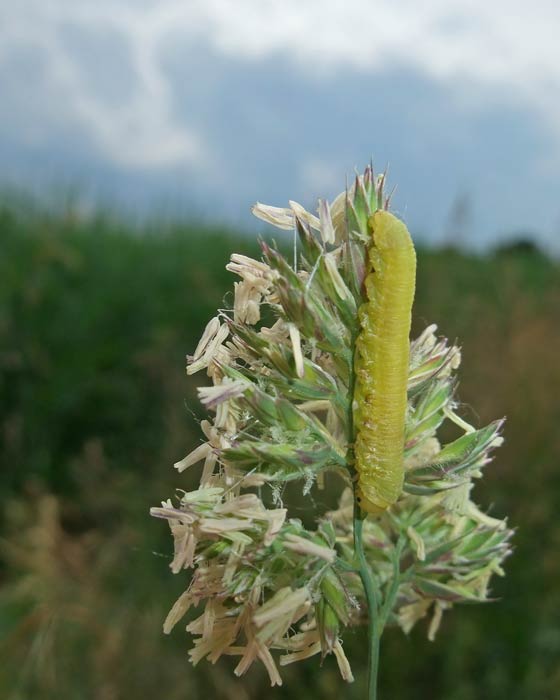 Raupe auf Gras mit Augen: Eine Blattwespenlarve ...mehr über unsere → Blattwespen im Glemstal → Raupen im Glemstal → Katharinenlinde in Schwieberd. |