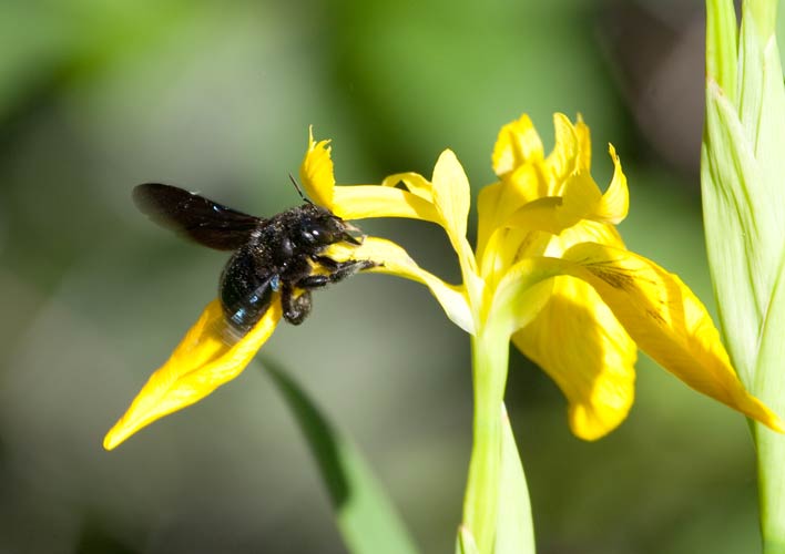 blaue Holzbiene auf gelber Schwertlilie (Iris pseudacorus) ...mehr über unsere → Wildbienen im Glemstal → Schwertliliengewächse im Glemstal |