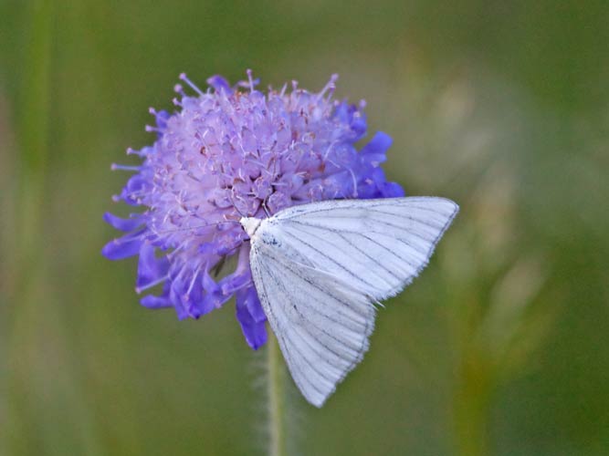Hartheu-Sanner (Siona lineata) auf einer Wiesenwitwenblume ...mehr über unsere → Spanner im Glemstal → Kardengewächse im Glemstal |