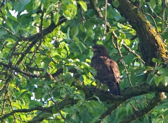 Das ist der Mäusebussard, der dort sein Revier hat. Er sitzt auf einem Baum oben in der Wiese und schaut uns an. Wir waren zu dritt. Er ist nicht zu uns her geflogen. ...mehr über unsere → Mäusebussarde im Glemstal |