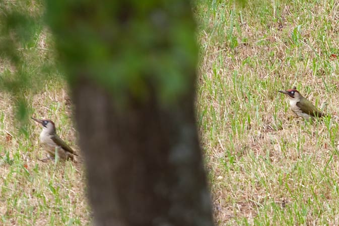 Grünspecht-Paar unten auf der Wiese, wo der Mäusebussard hockt. Rechts ist