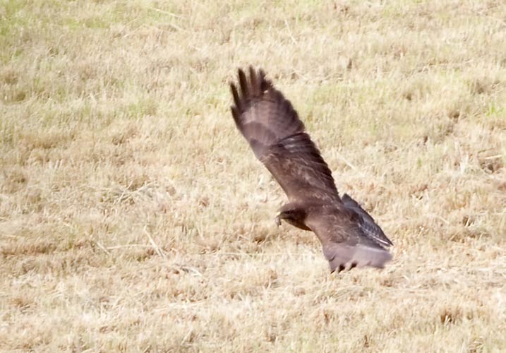 Der revierbesitzende Mäusebussard hat auf dem Acker neben dem Fahrweg eine