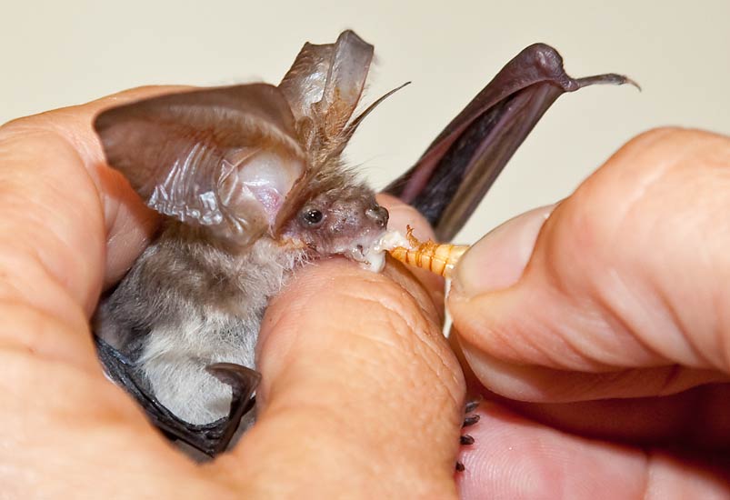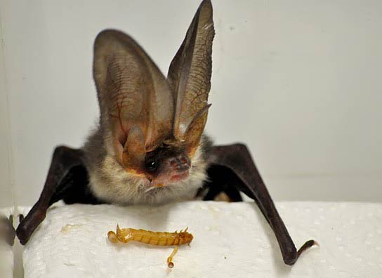 die Langohrfledermaus bekommt Mehlwürmer zum Futtern ...mehr über unser → graues Langohr im Glemstal → NABU-Raum Schwieberdingen |