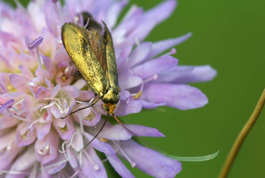 eine weibliche Langhornmotte (Nemophora metallica) auf einer Wiesenwitwenblume (Knautia arvensis) am Heimberg ...mehr über unsere → Langhornmotten im Glemstal → Kardengewächse im Glemstal → Naturdenkmal "Heimberg" |