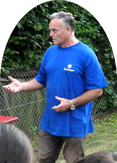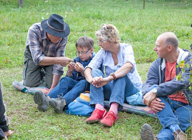 | 58 Teilnehmer mitten in der Urlaubszeit und bei hohem Regenrisiko (es hatte mittags geregnet) sind erfreulich viel | Manfred Herda (links) inspiziert einen Sender mit dem Steinkäuze besendert werden |