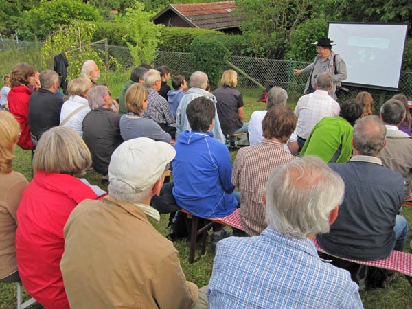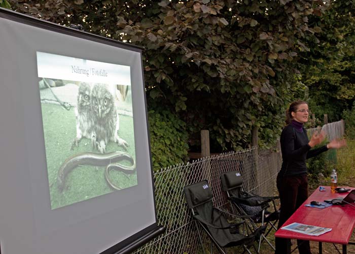Eine Steinkauz- Geschichte von Herbert Keil amüsiert die Zuhörer: "Abends lag eine Blindschleiche in der Steinkauz-Röhre. Die Bäuche der Steinkäuze waren alle ganz dünn. Am nächsten Morgen war die Blindschleiche komplett weg. Alle Steinkäuze hatten aber ein dickes Bäuchlein." | Die Zuschauer bestaunen amüsiert wie sehr ein Steinkauz den Kopf verdrehen kann |