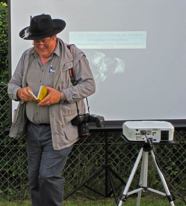 Thomas Gölzer vom NABU kündigt den Vortrag von Herbert Keil an: "25 Jahre Schutz und Forschung am Steinkauz im Landkreis Ludwigsburg" | der Vortrag ist gut besucht |