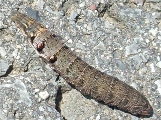 eine Raupe ca. 5 cm: besonders die beiden Scheinaugen hinter dem Kopf der Raupe sind beeindruckend: kleiner Weinschwärmer (Deilephila porcellus) ...mehr über unsere → Raupen im Glemstal → Schwärmer im Glemstal |
