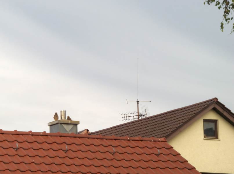 Ende Juli 2011 fliegen die jungen Turmfalken schon ganz munter herum und setzen sich auf Kamine, Fenstersimse und Bäume in der Nähe. Der junge Turmfalke unten links ist vom Balkon im Haus neben der Birke aus fotografiert. Er hatte sich auf das Dach gesetzt und uns zunächst gar nicht gesehen. Dadurch ist das Foto aus nur 3 m Entfernung entstanden. Dann ist er aber gleich wieder weggeflogen.