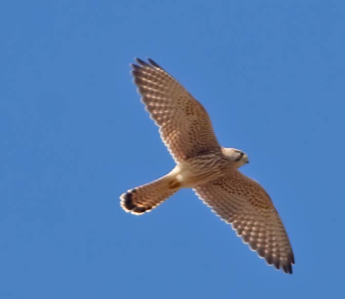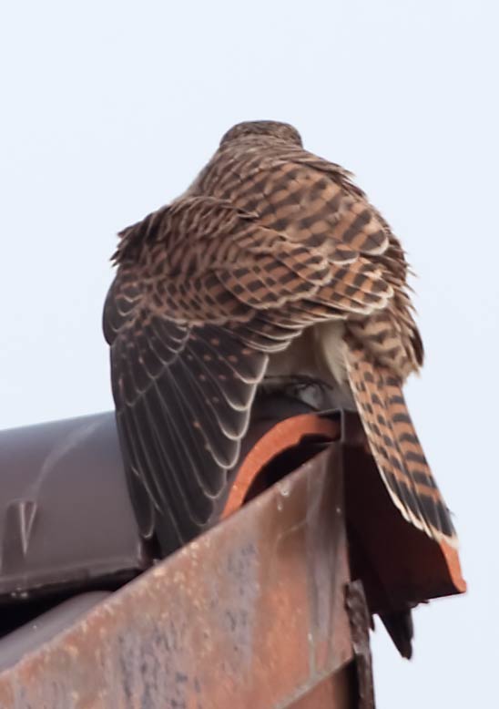 verschwunden waren, nochmal ein einzelner Turmfalke zurückgekommen: der Schwanz ist nicht grau, also kein Männchen. |