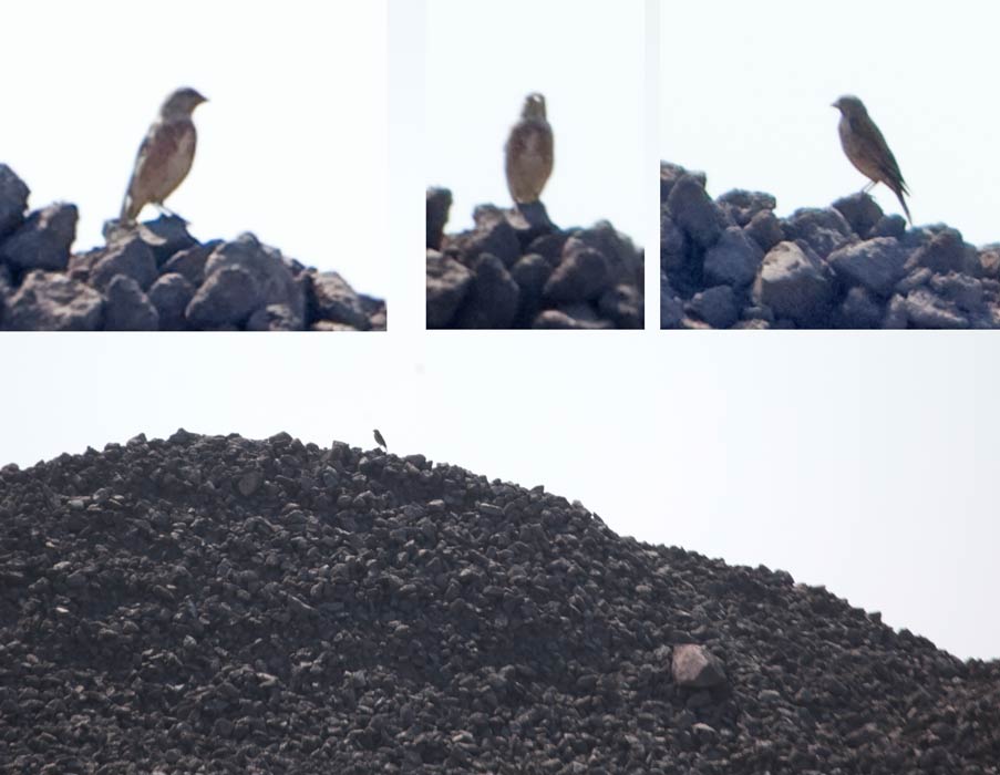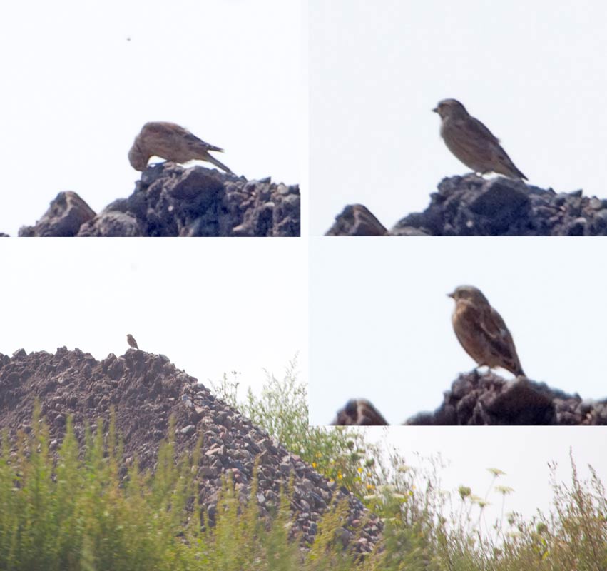 der "dickliche Vogel" auf demselben Steinhaufen: Bauch mit rötlichen Längsstreifen, Scheitel hellgrau, schwarzer Streifen unter dem Auge: ein weibl. Bluthänfling (Carduelis cannabina) (Danke an Jochen Völlm für die Artbestimmung am 21.8.2011) ...mehr über unseren → Bluthänfling im Glemstal |