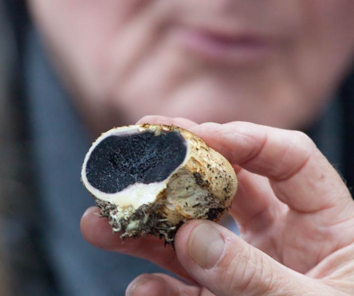 der junge Kartoffelbovist (Scleroderma citrinum) ist innen fest und weiß. Erst im Alter ist der Kartoffelbovist innen ganz schwarz. | Erst im Alter wird der Kartoffelbovist (Scleroderma citrinum) innen ganz schwarz. |