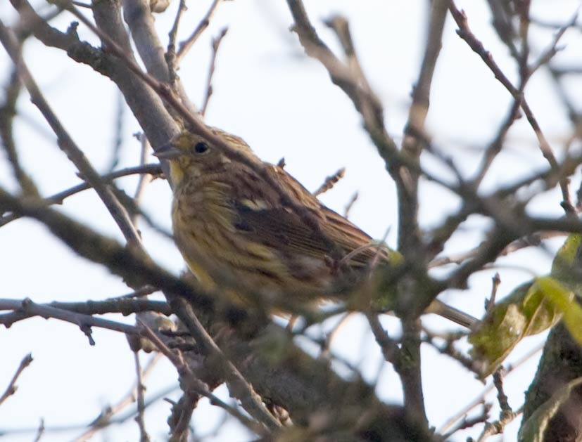 eine Goldammer (Emberiza citrinella) sitzt in einem anderen Baum