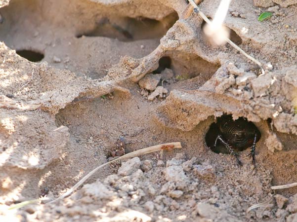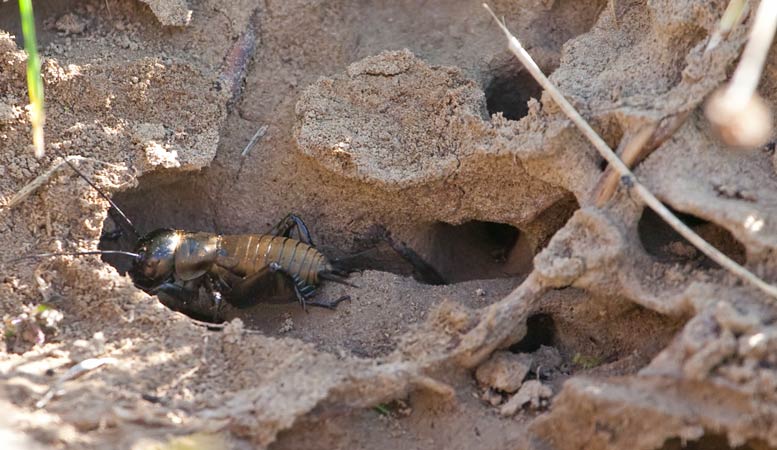Feldgrille (Gryllus campestris) vor Ihrer Höhle. Im nächsten Frühjahr wird sie sich zur Imago mit Flügeln entwickeln. ...mehr über unsere → Langfühlerschrecken im Glemstal → Naturdenkmal "Enzianwiese" |