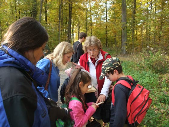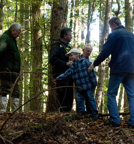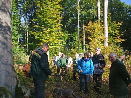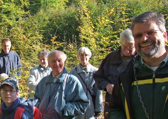 Mit Förster Frank im Heimerdinger Wald. links eine mächtige etwa 200 Jahre alte Buche ...mehr über unseren → Heimerdinger Wald bei Hemmingen |