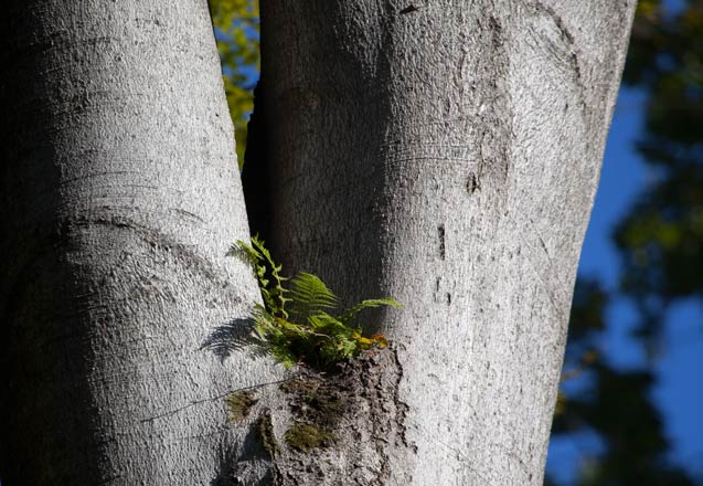 Wie im Urwald: Ein Farn wächst hoch oben in der Astgabel einer Buche im Heimerdinger Wald ...mehr über unsere → Farne im Glemstal → Baumarten im Glemstal |