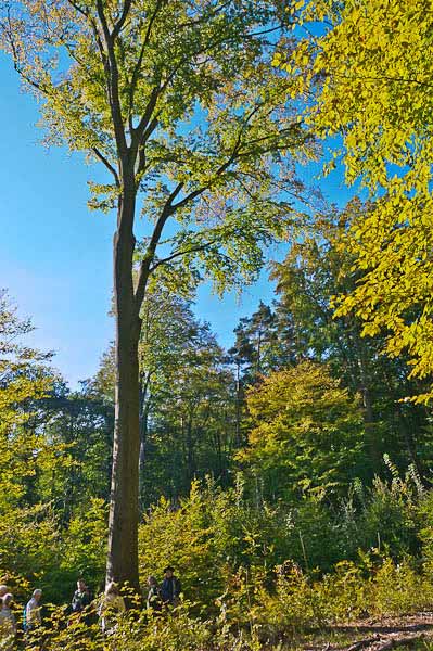 eine mächtige 200 Jahre alte Buche im Heimerdinger Wald und unsere NABU Wandergruppe (unten im Bild, wirkt ziemlich winzig) ...mehr über unsere |