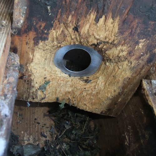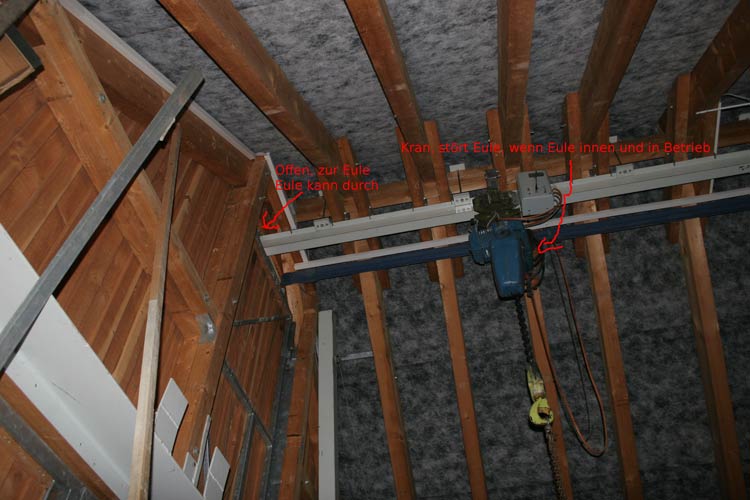 die Schleiereule kann durch das Loch links in den Stall. Andreas meint: " Unter dem Kran fanden sich auch Kotspuren und Gewölle, dort scheint sie auch öfter zu sein." |