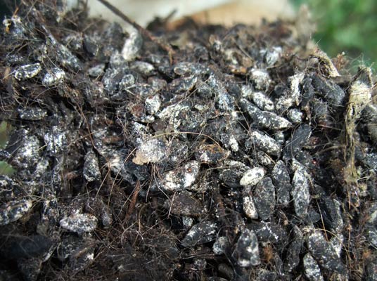 ein rätselhaftes Objekt im Nistkasten: Nur eine Art Losung aus ganz festen länglichen Kotpillen. In Summe ca. 5 cm dick. Sonst praktisch nix drin. |