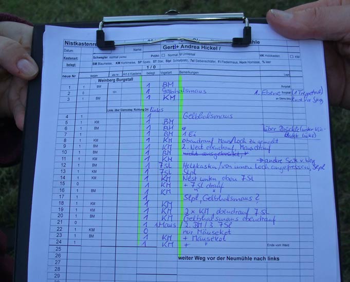 Die Liste der Nistkastenbelegungen. Auffällig viele Nistkästen mit schwarzem Inhalt in einem bestimmten Gebiet. |