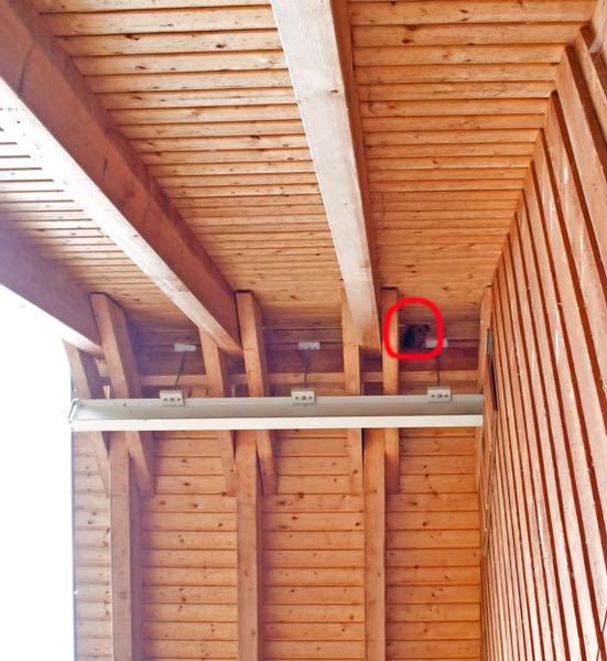 Unter dem First vom Pferdestall sitzt eine Schleiereule (im roten Kreis) ...mehr über unsere → Schleiereulen im Glemstal |