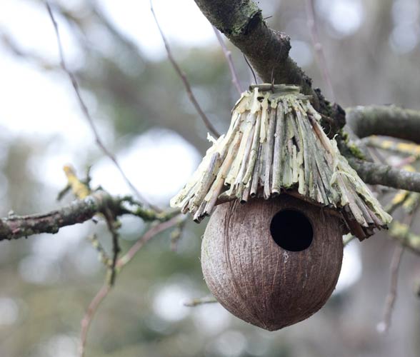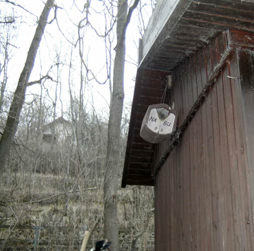 Dieser Nistkasten hat dreifach redundanten Marderschutz (hängt frei, spitzes Dach und Gitter am Loch) ...mehr über unsere → Steinmarder im Glemstal |