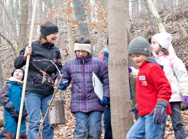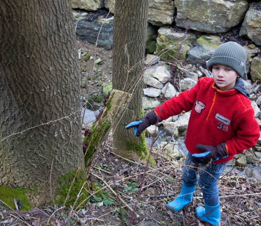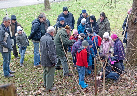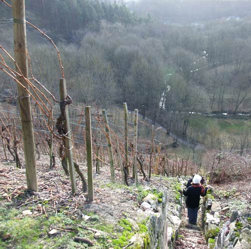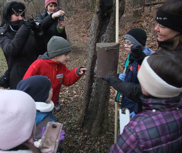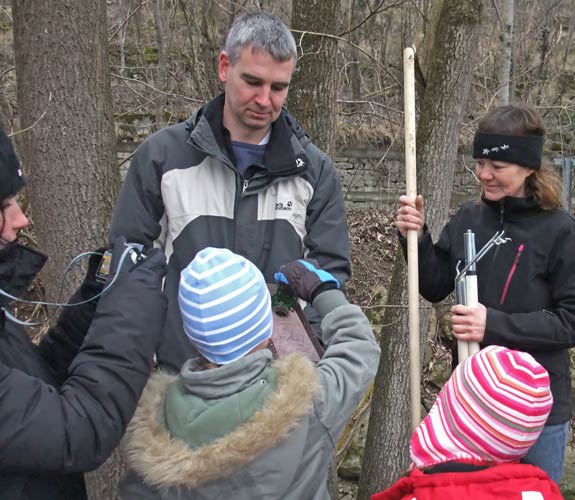 Die Hänge im Münchinger Tal sind steil. Conny Blazun holt die Nistkästen. Die Kinder immer mit Eifer dabei - rauf und runter. |