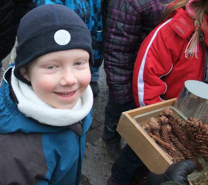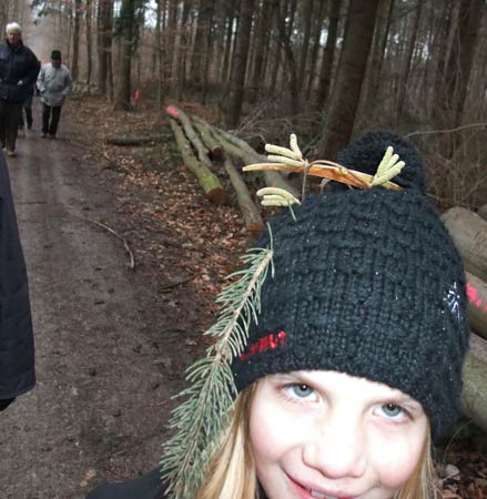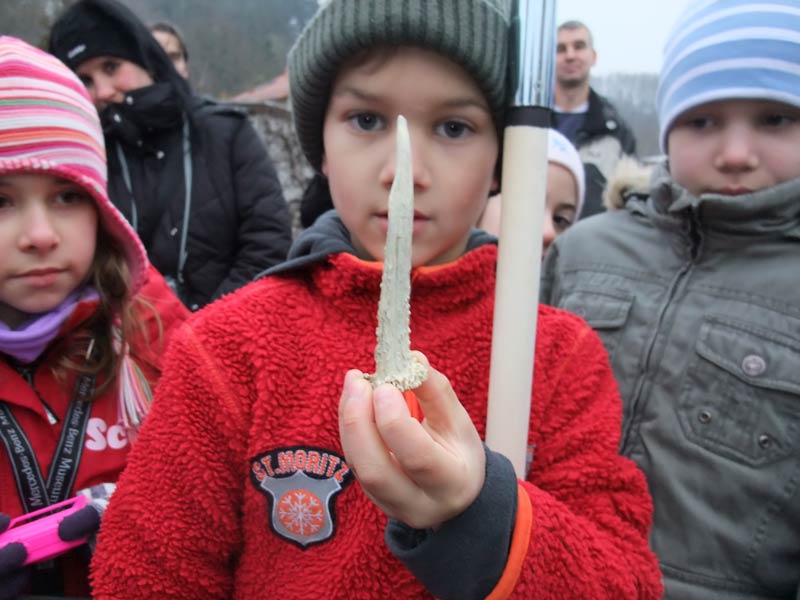 Lino Trinkmann zeigt ein Gehörn von einem jungen Rehbock. Hatte unser Jäger Manfred Herda für die Kinder dabei. Beim einjährigen Bock sind die Geweihstangen als einfacher, unverzweigter Spieß ausgebildet. ...mehr über unsere → Rehe im Glemstal |