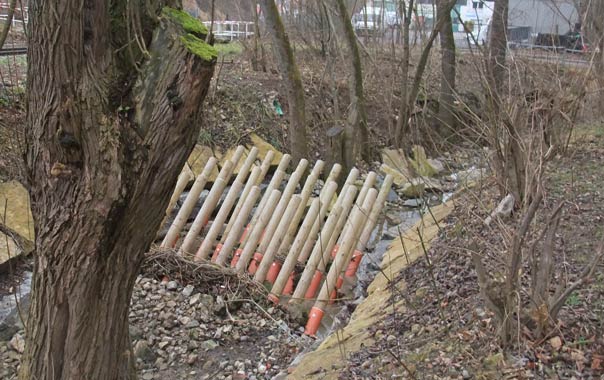 | diese Stangen im Räuschelbach sollen bei Überschwemmungen Äste auffangen und damit Schwieberdingen besser schützen vor Überflutungen durch den Räuschelbach |