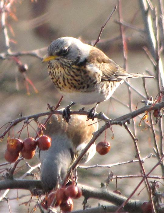 Wacholderdrossel mit gefrorenen Äpfeln ...mehr über unsere → Wacholderdrosseln im Glemstal |