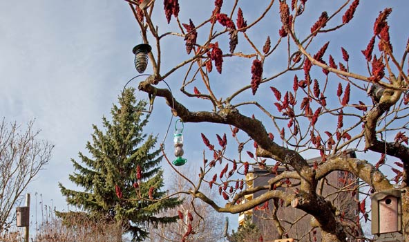 Essigbaum, Blaumeisenkasten (links) Kohlmeisenkasten (rechts) Meisenknödelspender und selbstgebauter Futterspender ... mehr über unsere → Blaumeise im Glemstal |