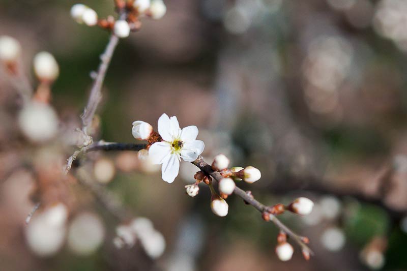 "Erst die Blüten, dann die Blätter" eine Schlehen-Hecke kurz vor dem Aufblühen. Eine Schlehenblüte ist schon offen. Schlehen sind Rosengewächse. ... mehr über unsere → Rosengewächse im Glemstal |