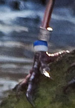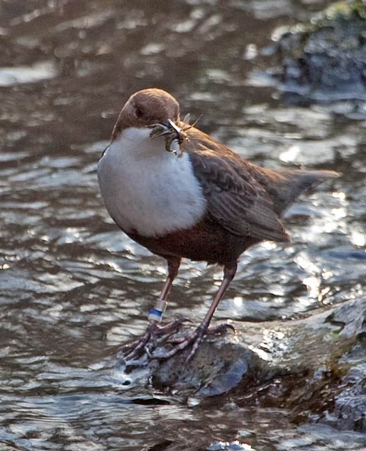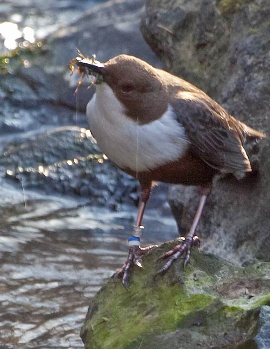 die Wasseramsel ist beringt mit einem Blechring und einem weiss-blauen