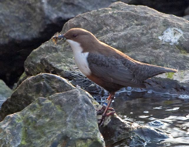 Am 26.3.2012 sehen wir eine der beiden Wasseramseln, die mit Futter im Schnabel
