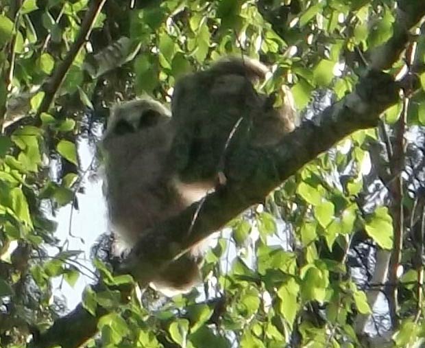 die Waldohreulen-Babies auf dem Ahornbaum im Nachbargarten sitzen in Zweiergruppen