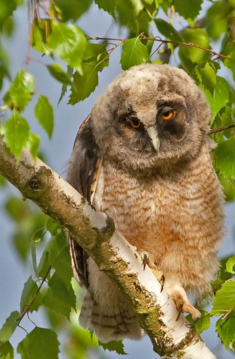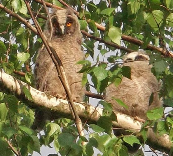 Zwei Ästlinge der Waldohreule auf einer Birke