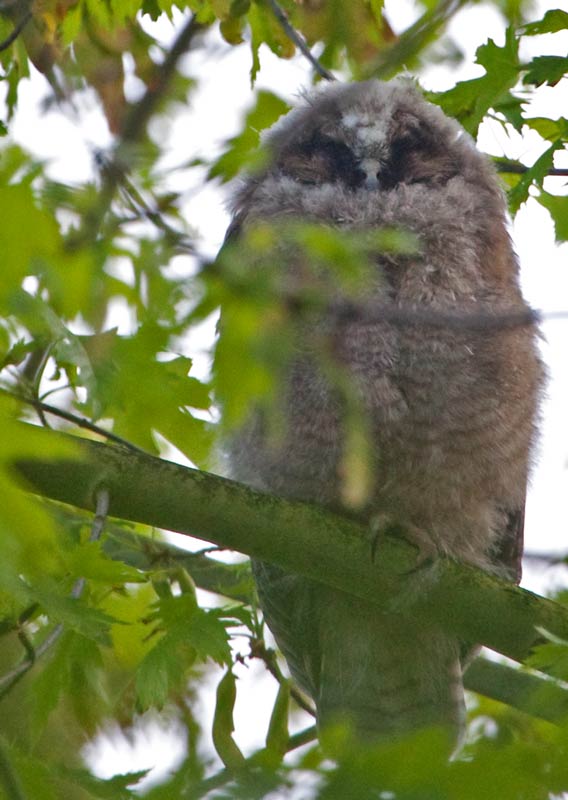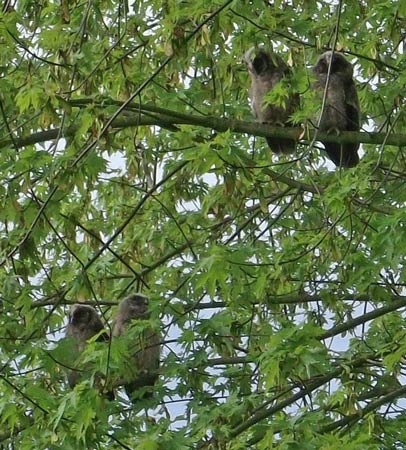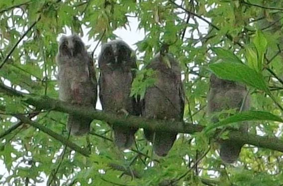Hr. Gunzenhauser hat heute alle vier Waldohreulen-Babies nebeneinander hockend erwischt auf dem Ahorn im Nachbargarten