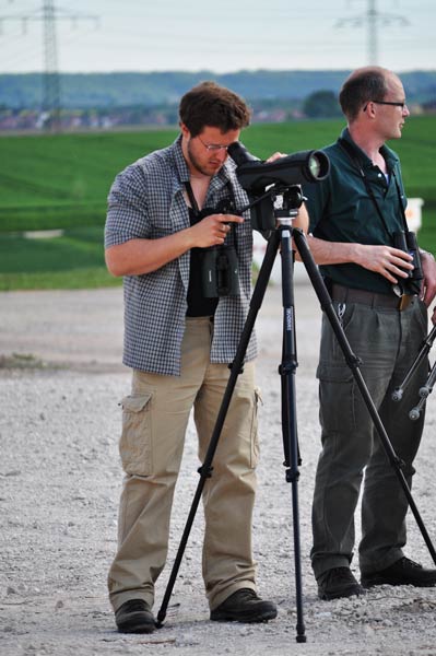 Ronald Meinert und Jochen Völlm hören einen Feldschwirl an der NW-Ecke der Deponie. Rechts: gleiches Foto, aber auf 60kB komprimiert ... mehr über unsere → Grasmücken im Glemstal |