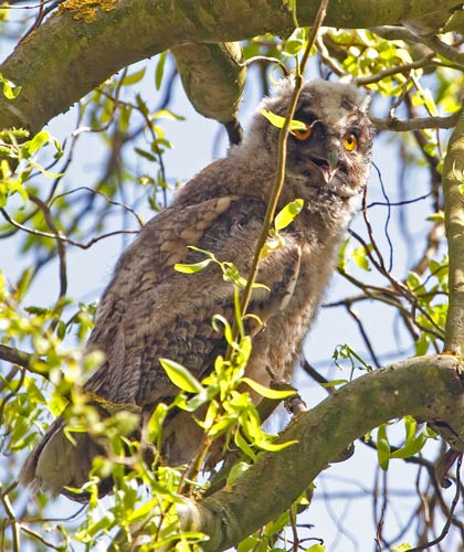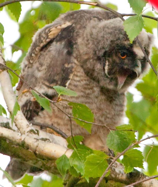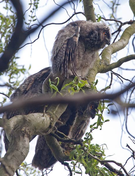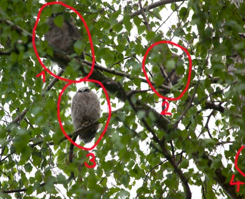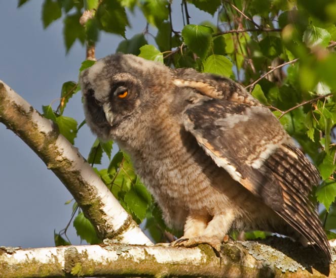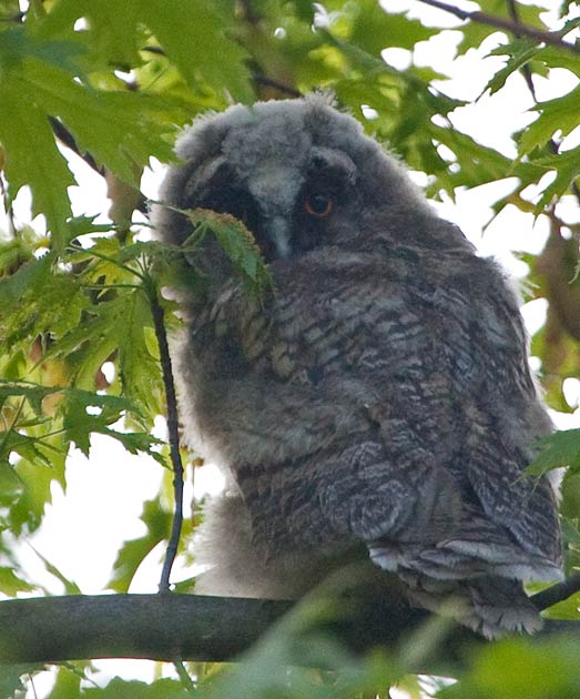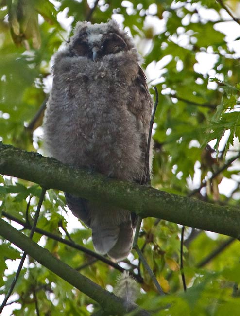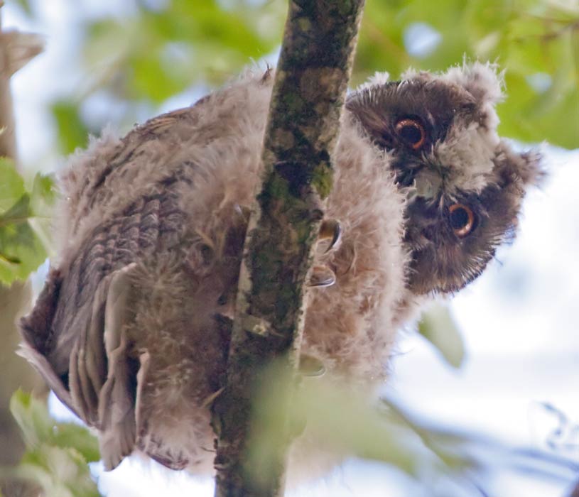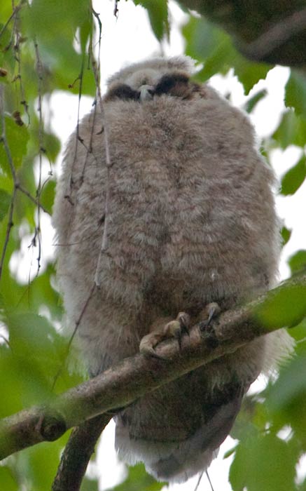 Sie verlieren Federn! Siehe unten am Schwanz. Abends waren nur noch 3 Waldohreulen-Babies zu sehen auf zwei Bäumen. Hier Fotos von Baby A |