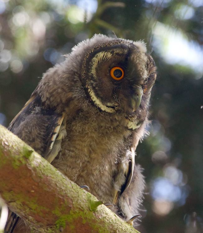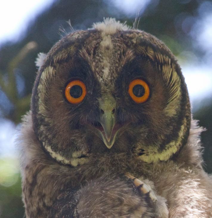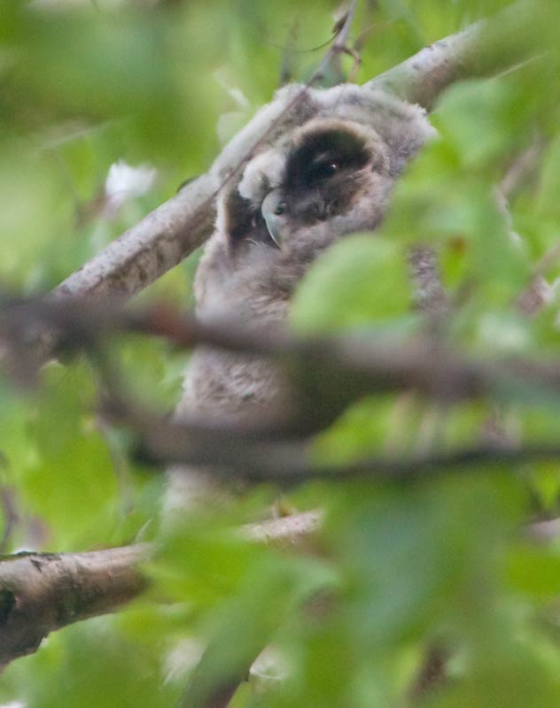 Dieses Waldohreulenkind (Ästling) wirkt etwas fertiger. Es hat auch weniger Flaum. Zum Glück schien bei diesem Foto mal kurz die Sonne.