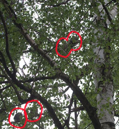 Frau Gisela Gunzenhauser schreibt mir am 9.5.2012: "unsere "Jungen" machen heute einen Besuch im Nachbargarten. Gestern Abend sind sie weiter gezogen und haben heute den ganzen Tag dort auf dem Ahorn gesessen. Mal alle vier beieinander, mal zwei und zwei. "