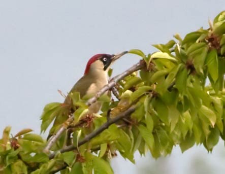Ein Grünspecht sitzt in der "neuen" rekultivierten Streuobstwiese beim