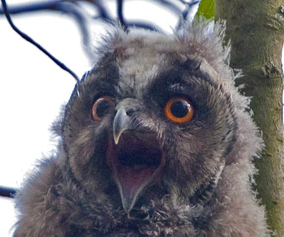 Das rechte Waldohreulenkind ist wach und schaut nach hinten | Am 6.5. sitzen wieder 2+2 Waldohreulenkinder auf der Birke |