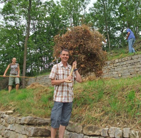 Biotop-Aktion am Burgstall: Markus Hansen transportiert Heu ab. So soll der Boden magerer werden ... mehr über unser → NABU Grundstück Burgstall