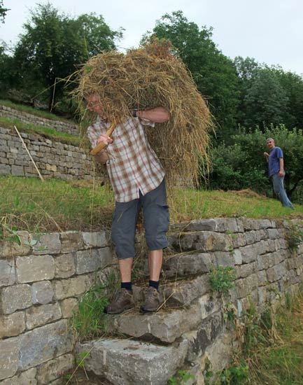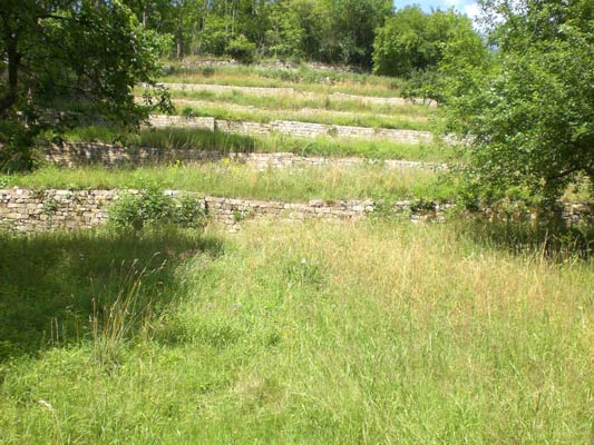 Biotop-Aktion am Burgstall: Vorher liegt viel Heu auf den Terrassen und die Mauern sind beschattet durch Brombeeren, Moose und andere Pflanzen. |